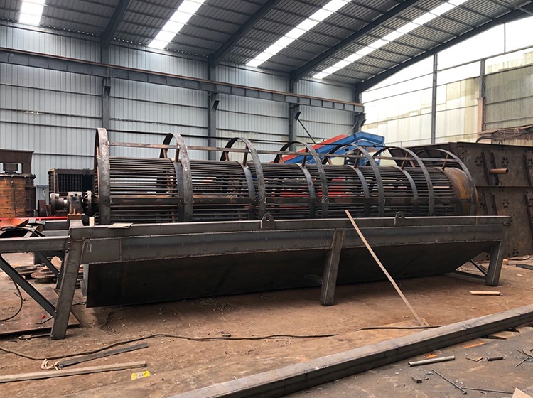轉筒洗石機采用中心結構,螺旋葉片在筒內壁上,由減速器連接到中心軸上進行工作。借助固體顆粒的比重不同,因而在液體中沉降的速度不同的原理,進行機械清洗的一種設備。滾筒洗石機的清洗筒體有鋼架支撐,電機帶動減速機,皮帶動清洗筒體低速旋轉。含有泥團和石粉的骨料自進料口給入,進入旋轉的滾筒內,被清洗滾筒內安裝有一定角度的耐磨橡膠襯板不斷帶起拋落,自進料端到出料端移動過程中多次循環(huán),并被順向或逆向的沖洗水沖涮洗滌,清洗干凈的骨料經過卸料端筒篩篩分脫水后排出。含有污泥的廢水則通過出料或給料端的帶孔擋板流出。