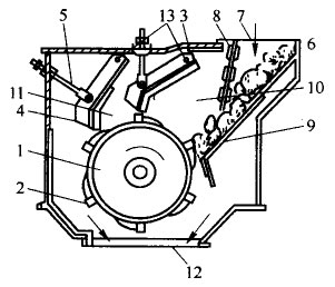 單轉子反擊式破碎機結構如圖,物料內進料口7下到破碎機體6內。為了防止破碎后的料塊從進料口飛出,在進料口處裝有一排鏈條8,給入的料塊落到算條篩9上,細小的碎塊經篩下直送排料口12,大塊的物料順算條落到轉子1上。轉子軸上面裝有凸起一定高度的板錘2。板錘根據(jù)轉子直徑大小有4—6排。轉于內電動機經過聯(lián)軸器和軸帶動轉子轉動。料塊就在高速旋轉的板錘和反擊板3之間來回碰撞破碎,在蓖條篩、轉子1,反擊板3及進料口鏈條所組成的空間內形成強烈的沖擊區(qū)10,物料破碎后又落到反擊板3和反擊板4以及轉子1所組成的第二沖擊區(qū)11內近一步受到沖擊粉碎。破碎后物料經轉子下方排料口12排出。